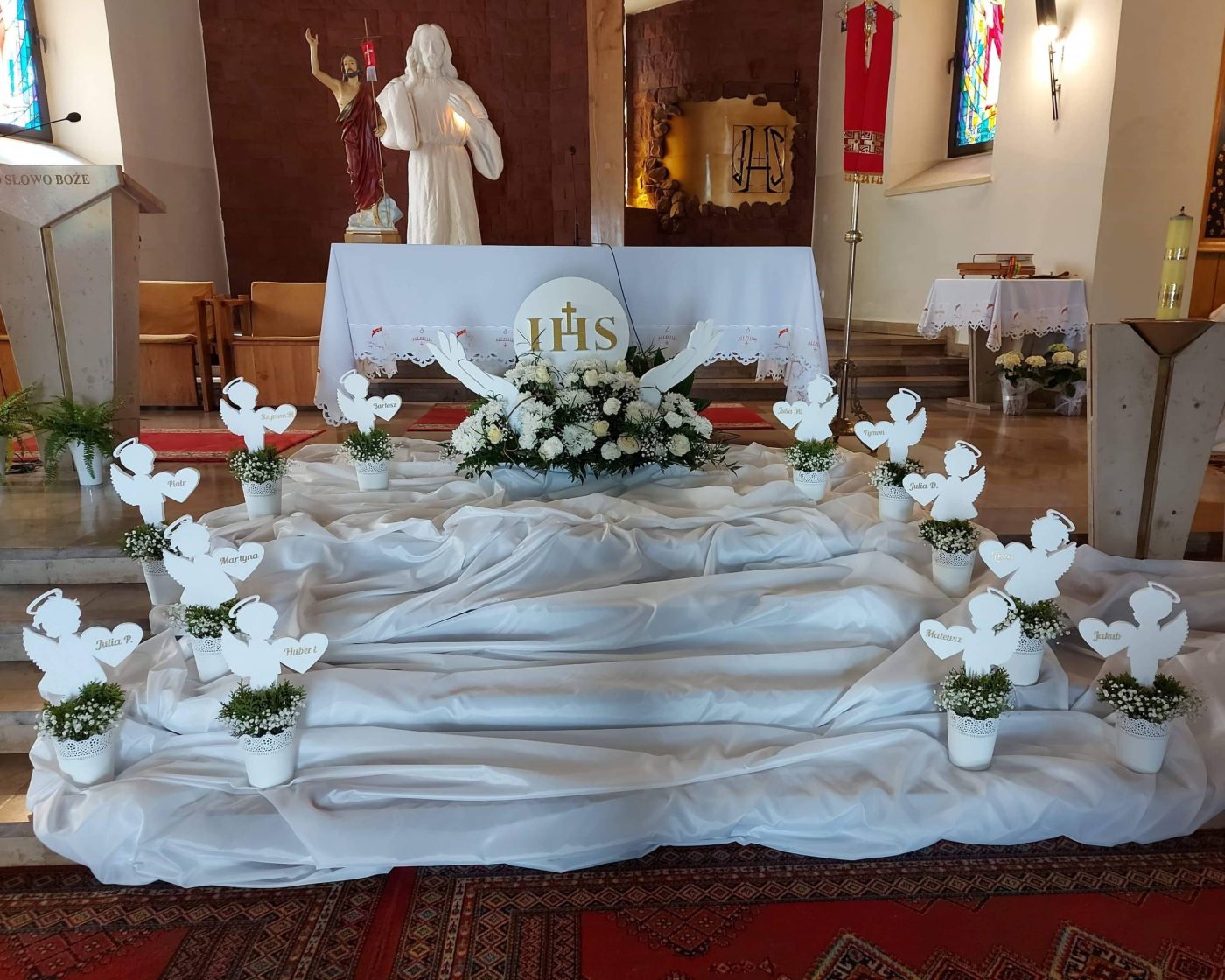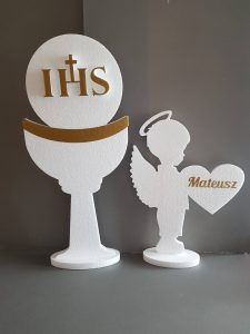 Dekoracje wykonane są z wysokiej jakości styropianu – materiału lekkiego, ale jednocześnie bardzo trwałego i odpornym na uszkodzenia. Dzięki temu, będą stanowić piękną ozdobę przez długi czas, zachowując swój estetyczny wygląd zarówno w Kościele, jak i w sali, gdzie odbywa się przyjęcie komunijne. Wycinamy je z precyzyjnych szablonów, co gwarantuje bardzo dokładne i staranne odwzorowanie każdego detalu.