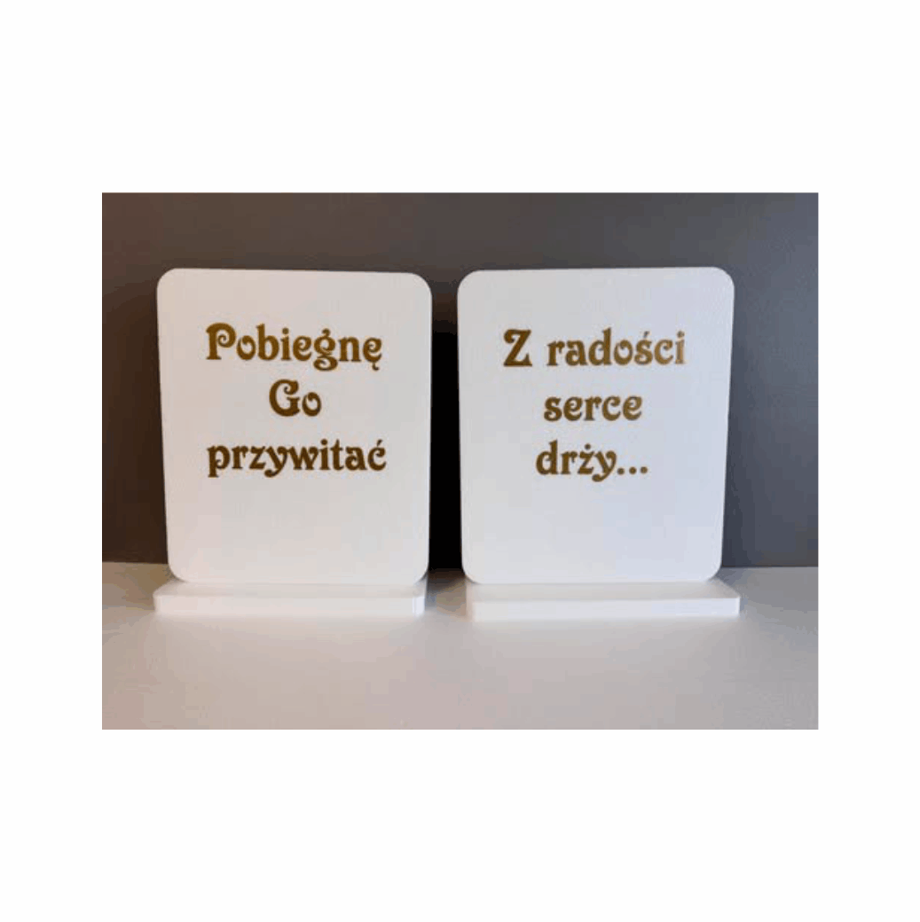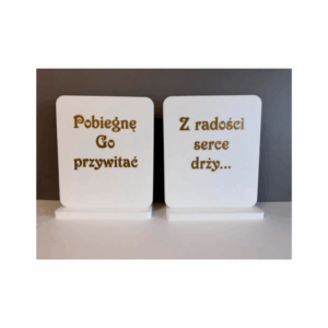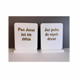 Tabliczki z cytatem “Pan Jezus już się zbliża…” 4 sztuki, do wyboru 3 rozmiary oraz kolor napisów złoty lub czarny. W cenę tabliczek wliczone są podstawki.